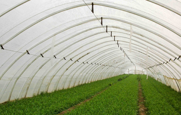 8) 棚扣好后,應(yīng)在膜面上每隔1.5米左右用上下對稱的竹竿或壓膜線加固,并備好草苫,用以在惡劣天氣進(jìn)行保護(hù)。